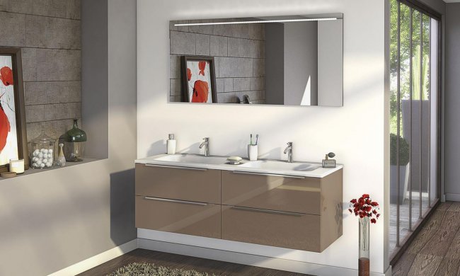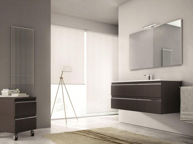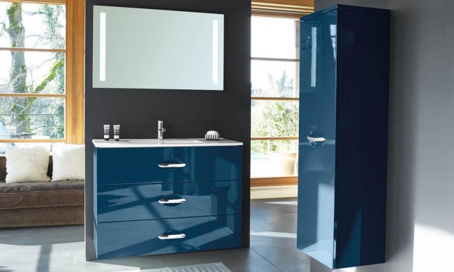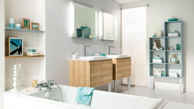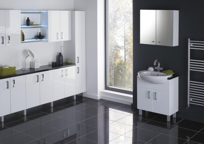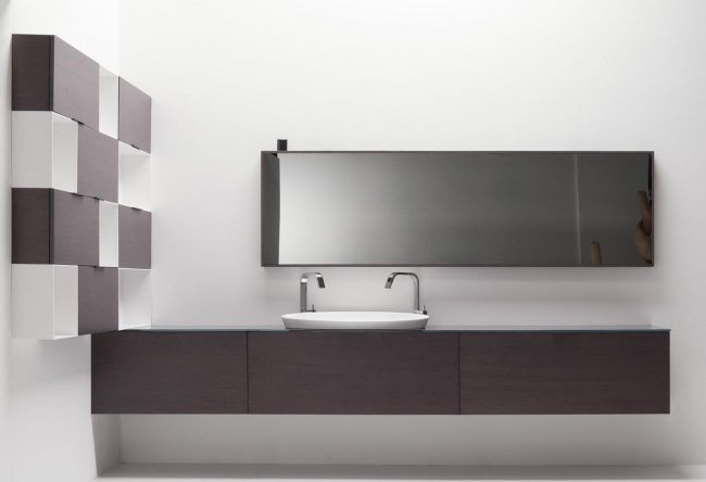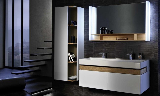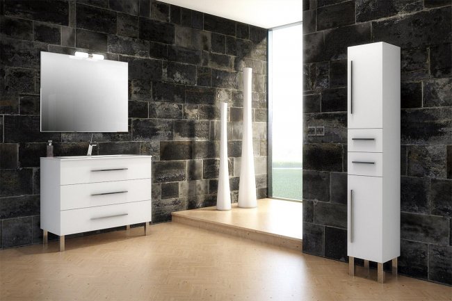 Представляет собой шкаф шириной 50-60 см. В варианте моноблоков есть явный фаворит – так называемый шкаф-мойдодыр. Это специальная установка под раковину. Чаще всего в столешнице раковины (если она есть) уже предусмотрено место для мойдодыра. Шкаф может иметь крепления для стены, а может просто стоять на полу или же перемещаться на колесиках. К нему подбираются остальные предметы меблировки – зеркала, тумбы, пеналы.