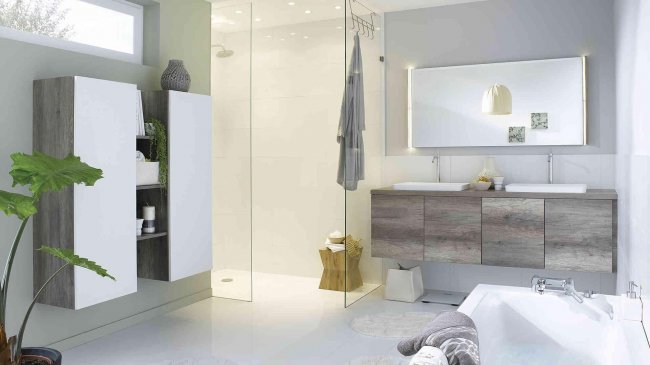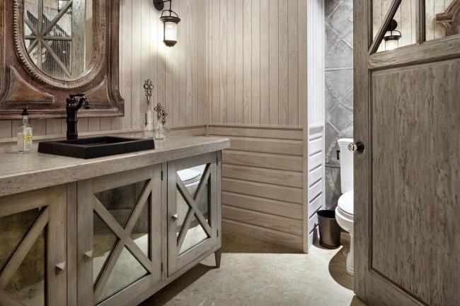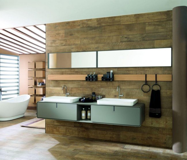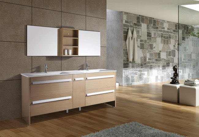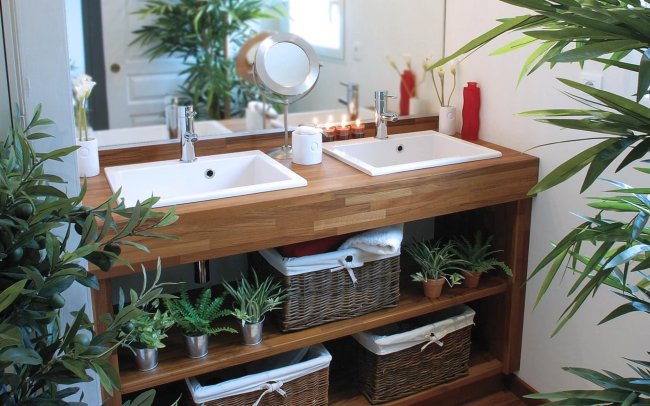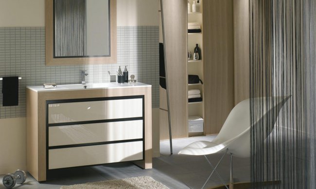Шкафы из ДСП, ДВП и МДФ обязательно облицовывают шпоном или покрывают лаком. Это защищает их от влаги. Стоит обратить внимание, что конструкции из ДСП для высокой надежности дополнительно защищают ПВХ-профилем. Не рекомендуется использовать в ванной мебель из натурального дерева. Бесспорно, такая конструкция будет очень красивой, но ее низкая функциональность сыграет в минус.