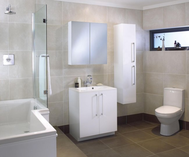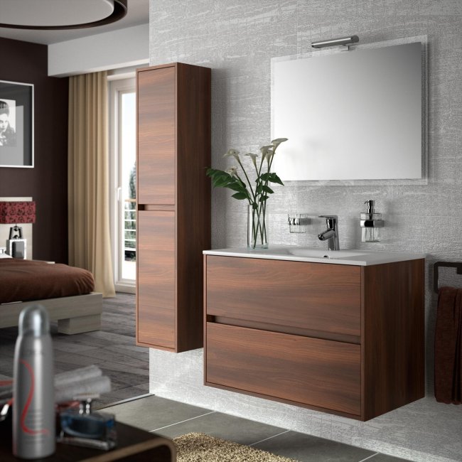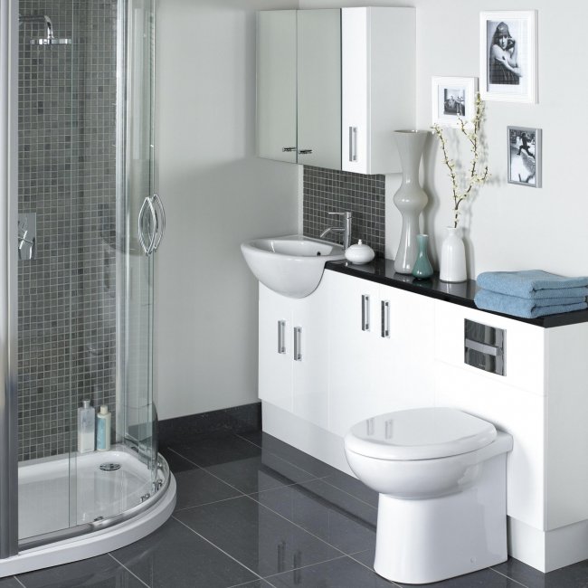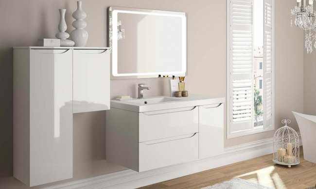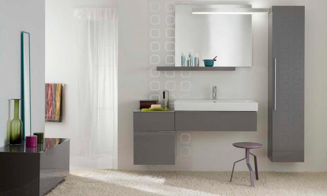 Набор небольших шкафчиков, как навесных, так и напольных. Также в наборе может быть корзина для белья и даже держатели полотенец. С этим "конструктором" можно "играть" самостоятельно или же доверить разработку дизайна профессионалу.
