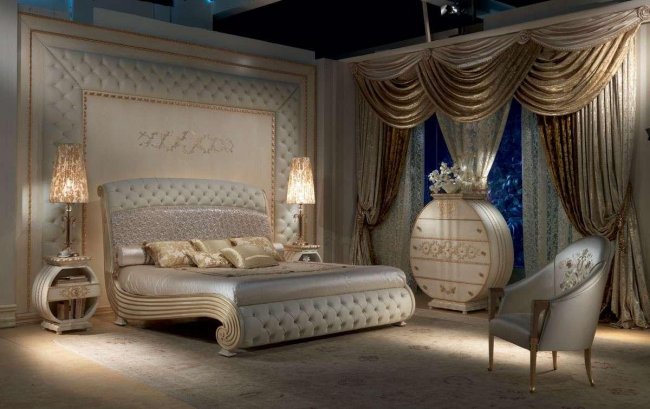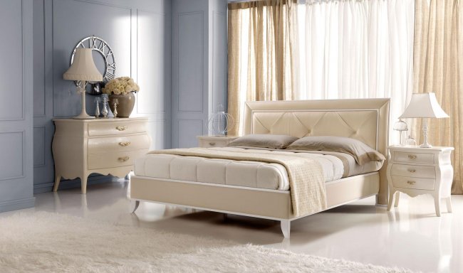 Так, спальня со светлой мебелью в интерьере удачно дополняется легкими и светлыми пастельными тонами обоев, штор или коврового покрытия.