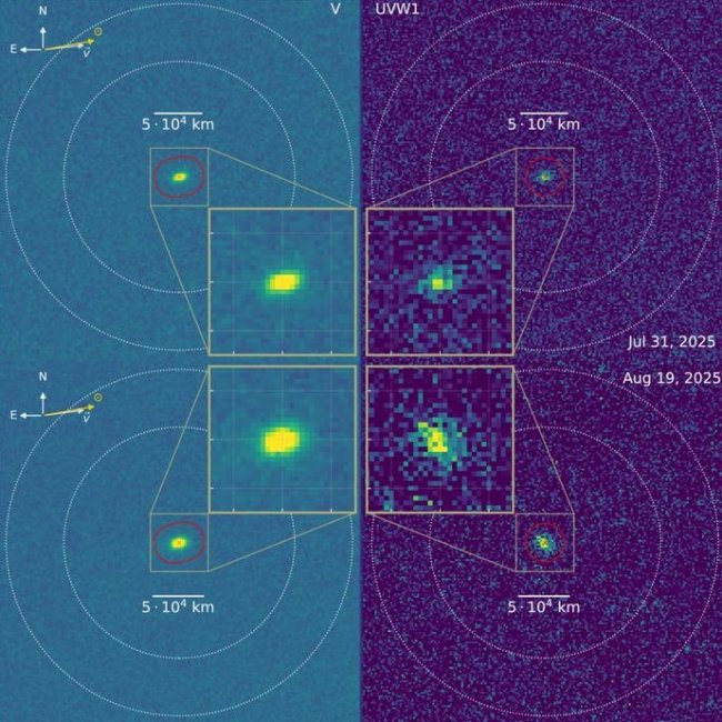 С помощью обсерватории NASA «Нил Герелс Свифт» команда из Обернского университета установила, что 3I/ATLAS высвобождает воду со скоростью примерно 40 килограммов в секунду, что сравнимо с работой пожарного шланга на полной мощности, и это при том, что комета находится на расстоянии почти в три раза большем от Солнца, чем Земля.