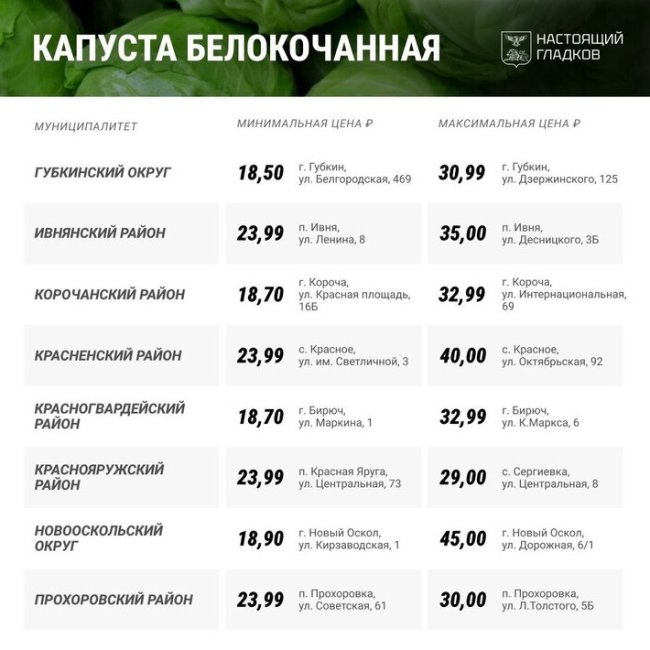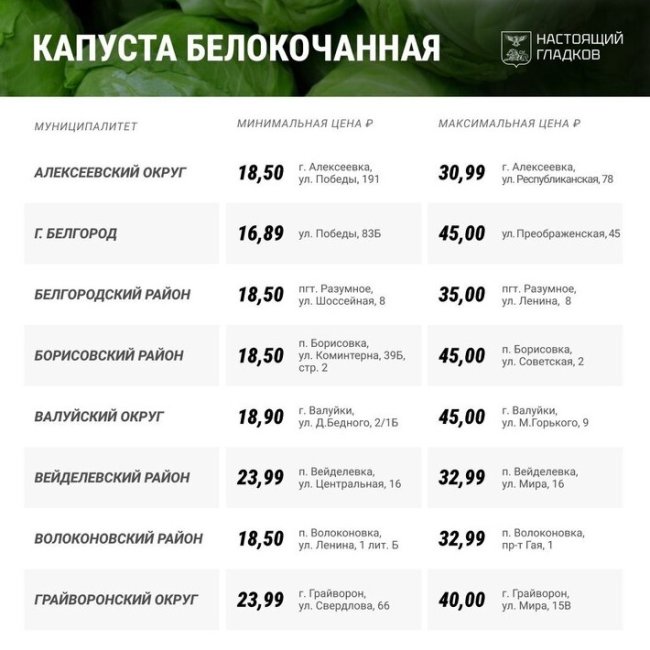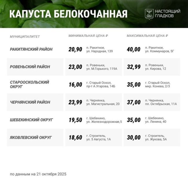 Губернатор Вячеслав Гладков сообщил белгородцам цены на белокочанную капусту в разных торговых точках области. Он опубликовал в телеграм-канале карточки с минимальной и максимальной стоимостью товара за 1 кг в разных районах и округах. Информация актуальна на 21 октября 2025 года.