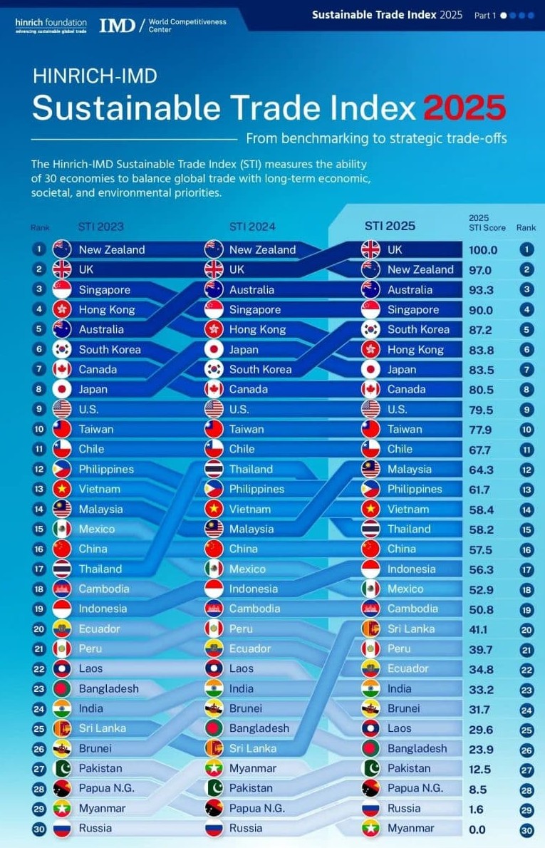 Фонд Hinrich Foundation представил обновленный индекс Sustainable Trade Index (STI) — ежегодный рейтинг 30 ведущих экономик мира, подготовленный совместно с IMD World Competitiveness Center. Индекс оценивает, насколько устойчиво страны ведут торговлю, сочетая экономическое развитие, социальную стабильность и экологическую ответственность.