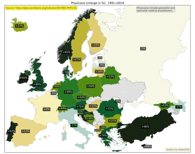 Изменение числа врачей показывает, как меняется доступность медицинской помощи. Показатель учитывает терапевтов и специалистов узкого профиля. Наиболее сильно число врачей выросло в Хорватии, Турции и Ирландии.