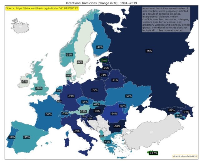 Показатель «умышленные убийства» не учитывает убийства, совершенные по неосторожности или при самообороне. С 1994 по 2019 год число убийств сильнее всего уменьшилось в Эстонии, Грузии и Болгарии.