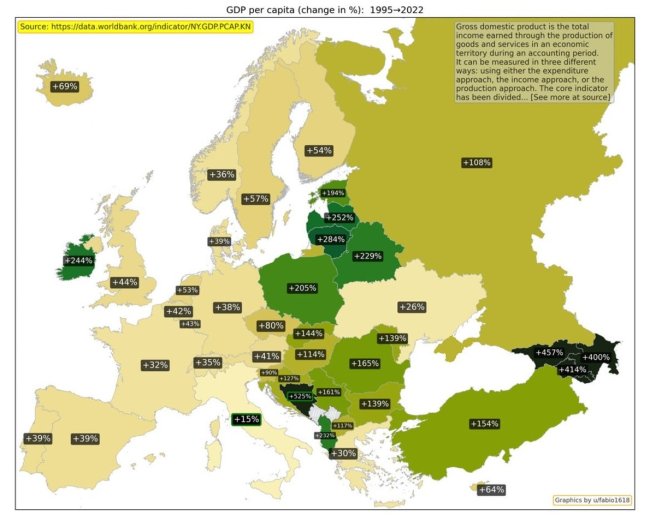 Валовой внутренний продукт на душу населения — один из основных показателей развития экономики страны. Сильнее всего ВВП вырос в Боснии и Герцеговине, Грузии, Армении и Азербайджане. Наименьший прогресс оказался у Италии.