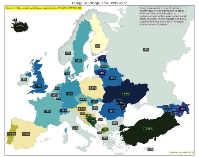 Показатель использования энергии отражает, сколько первичной энергии использовали до ее преобразования в другие виды топлива, к примеру, бензин. Рост потребления может быть связан с экономическим ростом, однако снижение может говорить о переходе на возобновляемые источники. Лидером по росту энергопотребления вновь оказалась Турция.