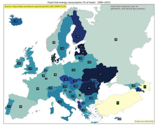 Потребление энергии из ископаемого топлива показывает, какую часть всей потребляемой энергии составляют уголь, нефть, нефтепродукты и природный газ. Сильнее всего этот показатель уменьшился у Дании, Латвии и Эстонии.