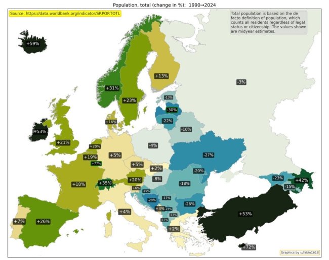Общая численность населения учитывает всех жителей страны, вне зависимости от их правового статуса или гражданства. Сильнее всего с 1990 по 2024 год выросло население Кипра, Ирландии, Исландии и Турции.
