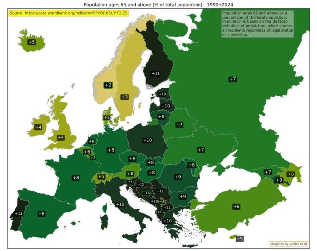 Доля населения в возрасте 65 лет и старше показывает, какая часть всех жителей страны относится к этой возрастной группе. Сильнее всего показатель вырос в Боснии и Герцеговине, Албании и Хорватии.