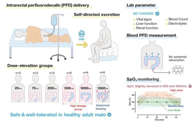 Добровольцам в возрасте от 20 до 45 лет была введена доза специального препарата, хорошо переносящего кислород, которую им требовалось удерживать в течение 60 минут. Безопасность и переносимость оценивались путем мониторинга побочных эффектов и жизненно важных показателей. Двадцать добровольцев удерживали жидкость в течение 60 минут, и при максимальном объеме 1500 мл наблюдались лишь легкие побочные эффекты в виде вздутия живота и дискомфорта. При этом все клинические лабораторные показатели, включая функции печени и почек, оставались в пределах нормы.
