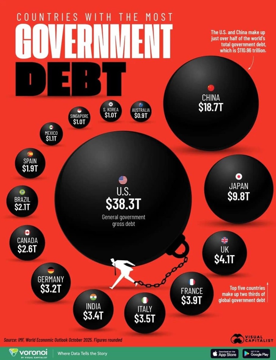 Объем мирового государственного долга в 2025 году достиг 110,9 триллиона долларов. Но на какие именно страны приходится его основная часть?
