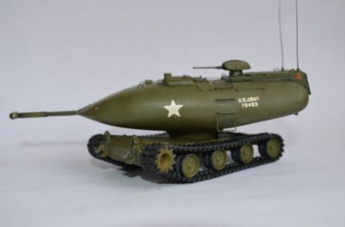 Его самой поразительной особенностью была капсулообразная башня, в которой размещались не только экипаж и основная 90-мм пушка, но также двигатель, трансмиссия и топливо. Все эти компоненты находились в водонепроницаемом корпусе, который мог плавать и приводиться в движение электроприводом.