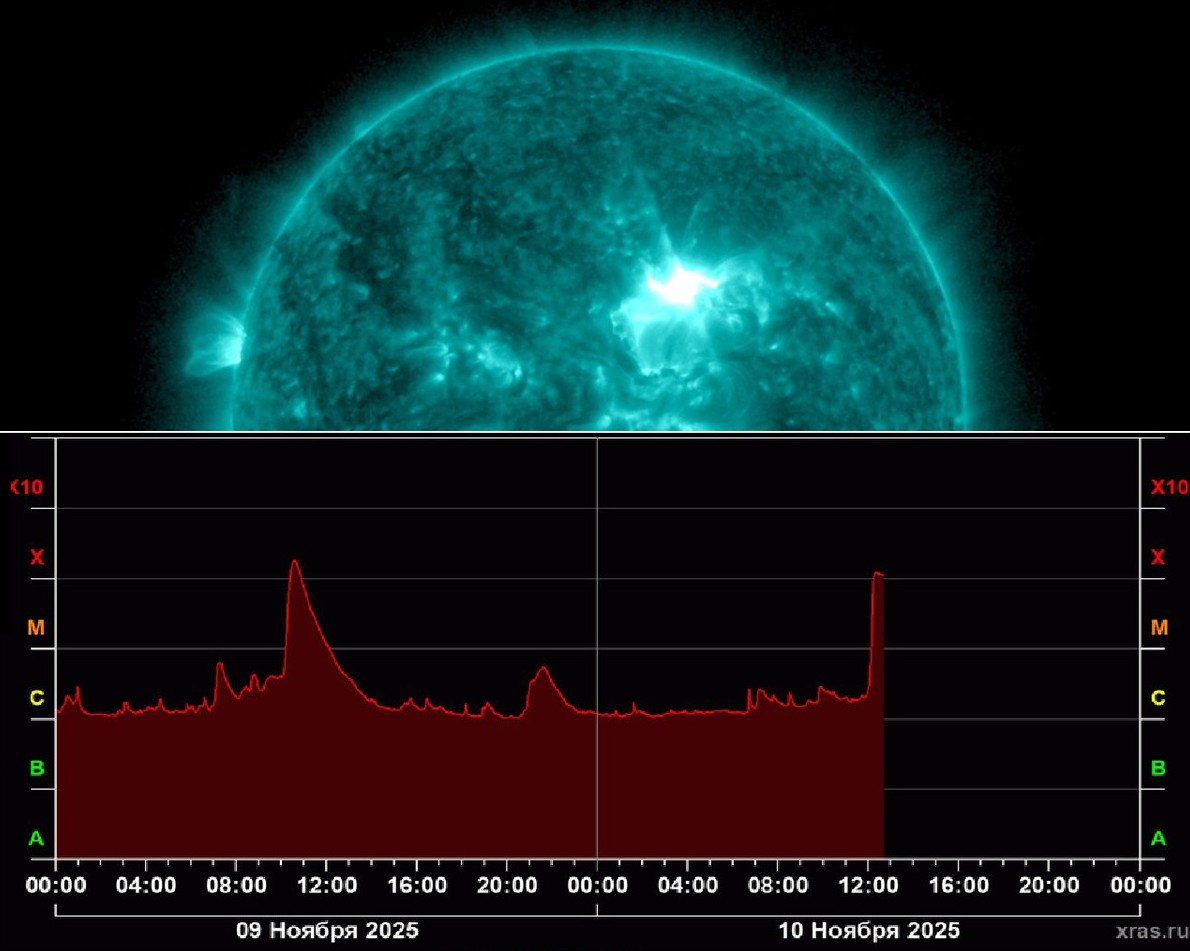 Специалисты продолжают: скорость нового выброса плазмы составляет не менее 1200 км/с — почти в два раза выше скорости вчерашнего события (720 км/с). «Выброшенное сегодня облако газа догонит распространяющийся сейчас в пространстве выброс плазмы от вчерашней вспышки X1.79, и к Земле они придут вместе — предварительно на стыке 11 и 12 ноября», — уточняют специалисты.