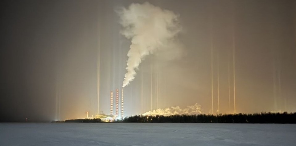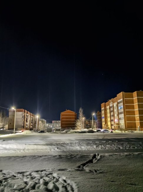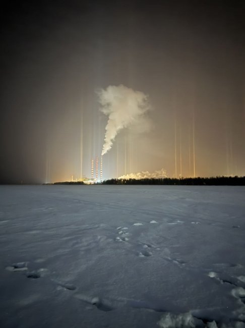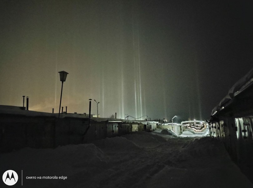 Такой эффект стал возможным из-за света Луны и уличных фонарей. Свет преломляется в кристаллах, из-за чего возникают светящиеся столбы. Чтобы такое явление могло возникнуть, необходимо несколько слагаемых: падающий мелкий снег, безветренная погода, источник света и температура ниже 10°C.