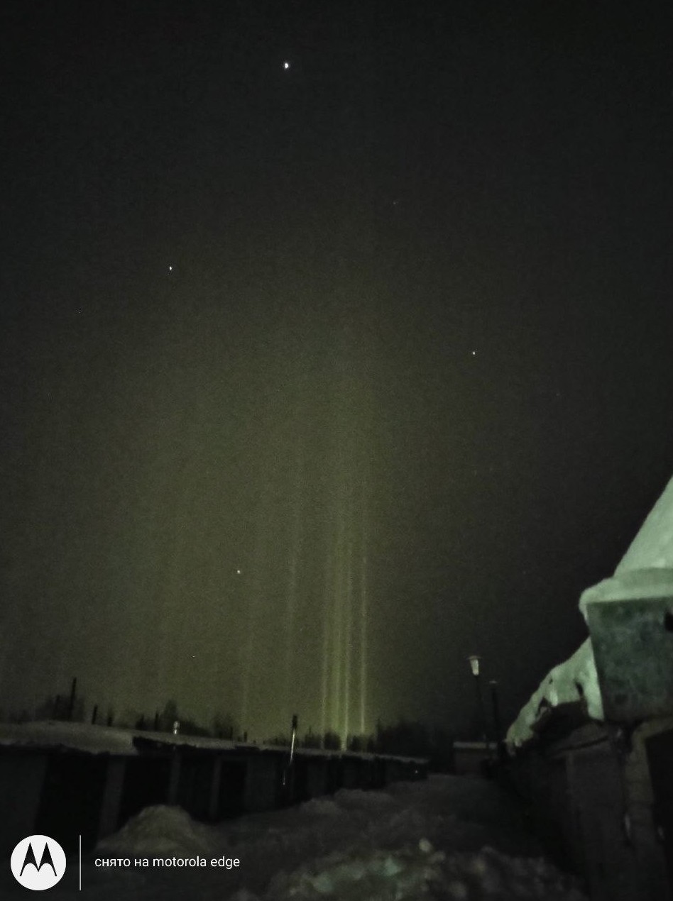 В нашу редакцию обратился читатель, который заметил ночью в небе над Новолукомлем загадочное свечение. Также его наблюдали в Лунинце. На старте свечение связали с северным сиянием, но на деле эти световые столбы возникли из-за мелких снежинок, наполнивших воздух.