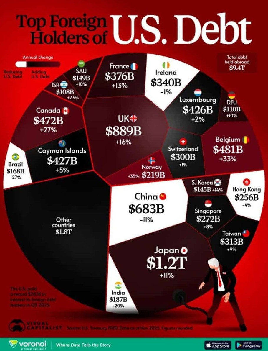 В 2019 году Япония обогнала Китай, что стало заметным сдвигом по сравнению с ситуацией десятилетней давности, когда Китай держал почти 1,3 триллиона долларов американского долга. С тех пор объем казначейских облигаций США у Китая сократился почти вдвое, тогда как японские вложения выросли более умеренно — примерно на 61 миллиард долларов за тот же период.