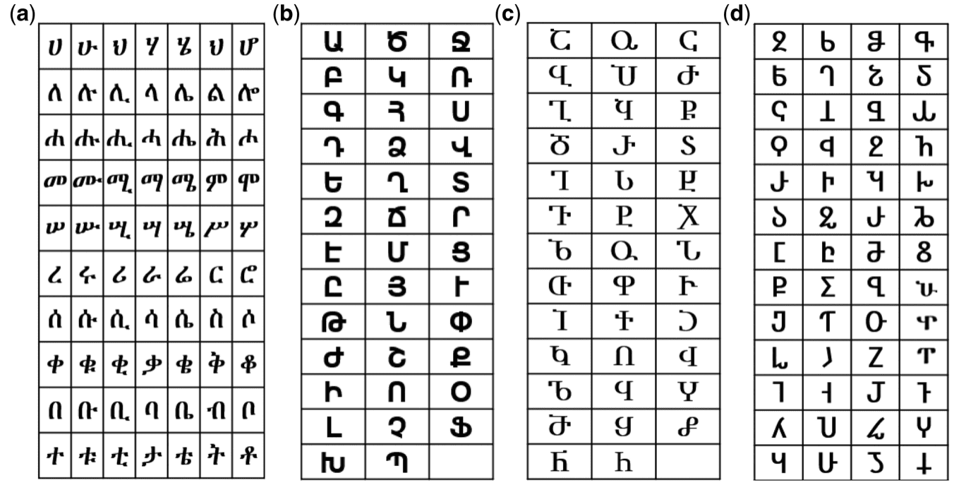Поэтому символов (аналогов «букв») в эфиопском письме буквально сотни (от пары сотен в древности до трех сотен в нашу эпоху). В то время как армянский алфавит времен его создателя Маштоца имел лишь 36 букв, которым соответствовали звуки, а вовсе не слоги.