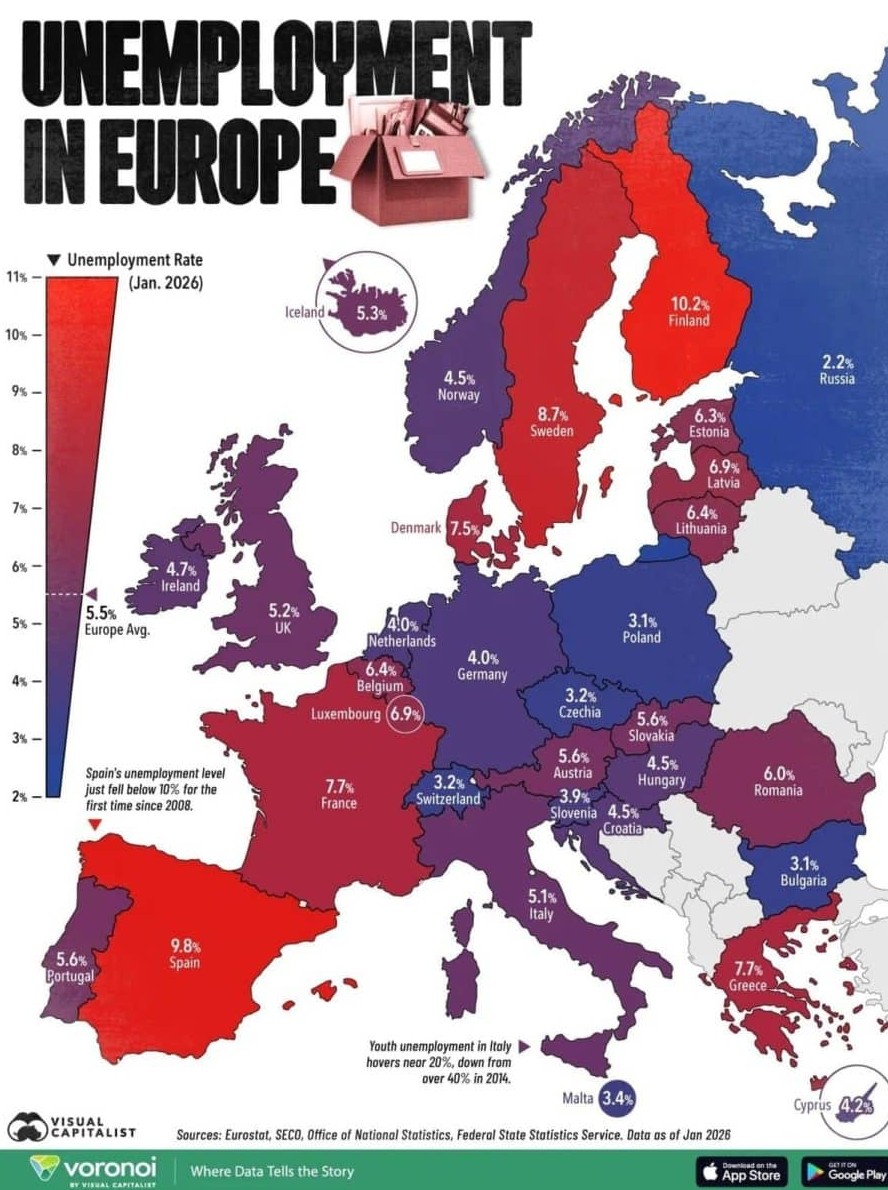 На карте выше представлены уровни безработицы по Европе на январь 2026 года, основанные на данных Eurostat, а также национальных статистических служб России, Швейцарии и Великобритании.