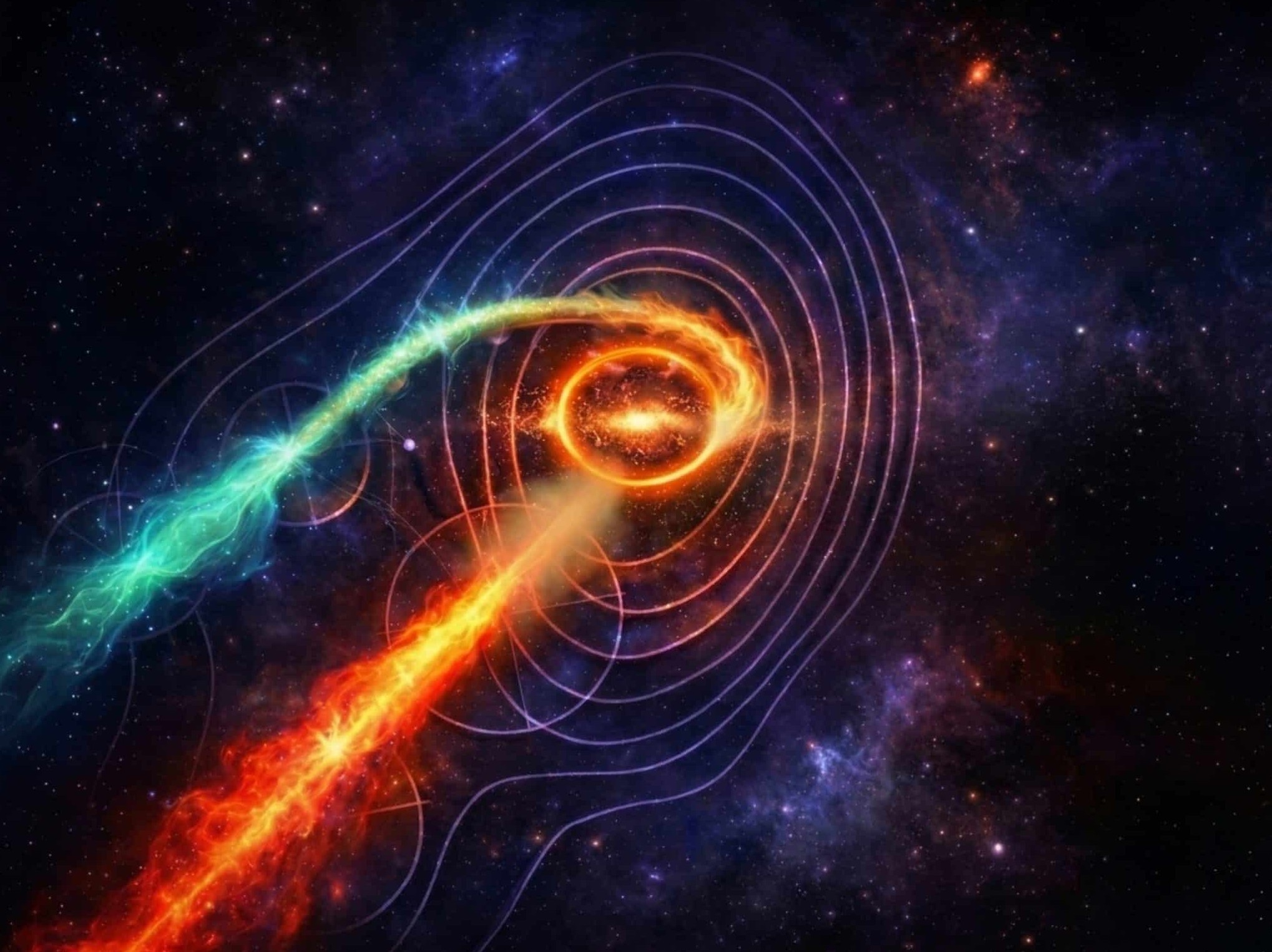 Форма второй струи также оказалась интригующей. На отдельных наблюдениях джет образовывал дугу, напоминающую неполное кольцо Эйнштейна — структуру, возникающую при гравитационном линзировании. Это означает, что свет от одного объекта может искривляться гравитацией другого, более массивного. Авторы научной работы, опубликованной в журнале Monthly Notices of the Royal Astronomical Society, предположили, что излучение связано с гравитацией СМЧД. Это косвенно указывает на наличие второго массивного объекта.