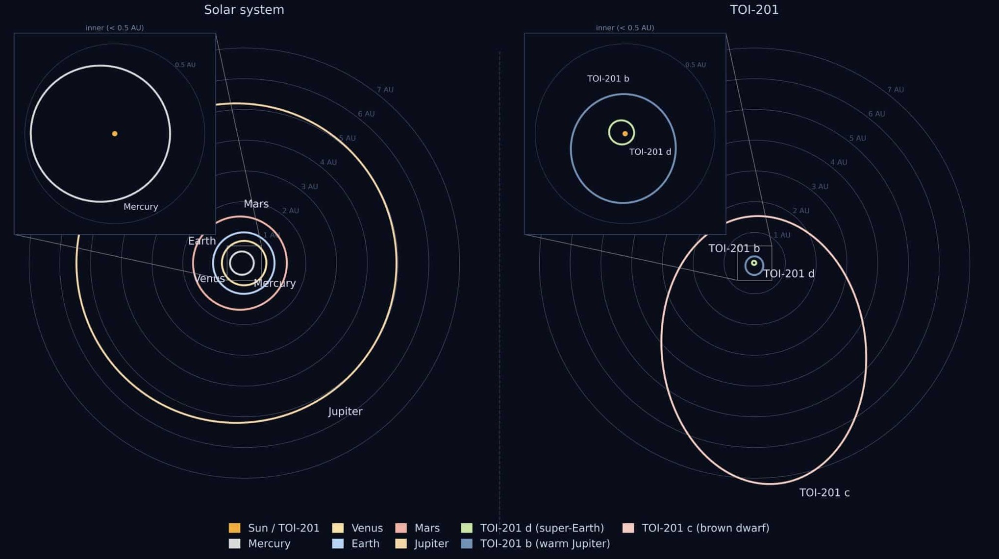 Многопланетная система TOI-201 меняла конфигурацию прямо во время астрономических наблюдений. Мощная гравитация местного коричневого карлика перекосила пути движения соседних каменистой суперземли и газового гиганта. Из-за этого непрерывного сдвига орбит все три космических тела временно перестанут пролетать перед своим светилом через 200 лет.