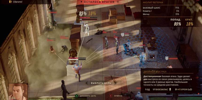 Вы можете свободно переключаться между героями в любой момент, если у них остались очки действия: сделать что-то одним персонажем, потом совершить ход другим, а затем опять вернуться к первому. Есть персонаж Джудит, бросающий липкую гранату, которая взрывается при поражении дистанционной способностью. Прилепили, а ходы закончились? Значит, выстрелит другой персонаж. Больше всего мне нравится Ингрид — после каждого убийства она получает бонусное очко действия. Поэтому я делал так: за других героев доводил здоровье противников до минимума и затем позволял Ингрид их добивать, благодаря чему она «выносила» по несколько противников за один раунд, используя только обычные удары.