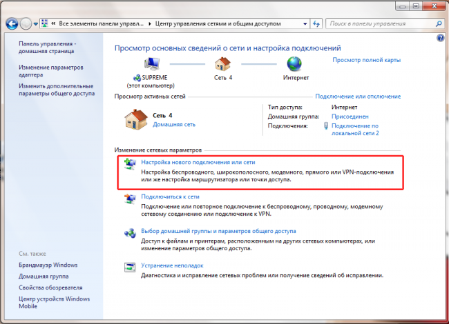 Теперь на компьютере нужно зайти в панель управления и выбрать «Центр управления сетями и общим доступом», где изменить параметры адаптера.