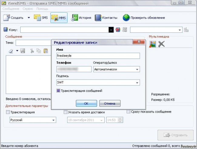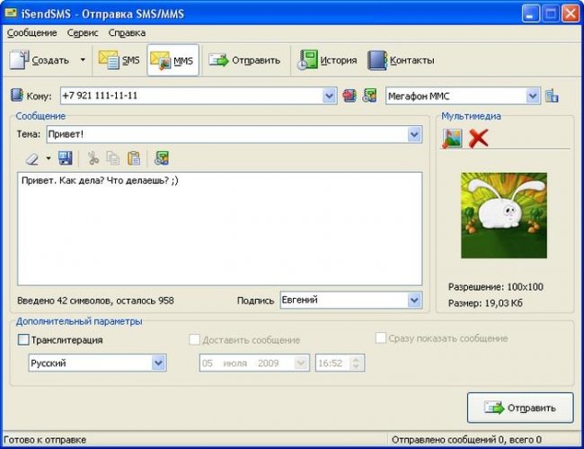Фото: окно iSendSMS