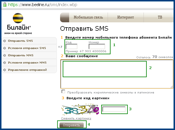 Абоненты этой сети также не обделены подобным онлайн-сервисом. Размер отправляемого текста тут ограничен 150 символами. В наличии и система автоматической транслитерации, которая за секунду «переведет» ваш текст в латиницу. Чтобы воспользоваться данной функцией, достаточно кликнуть на поле «включить транслитерацию», расположенное прямо под формой с текстом.