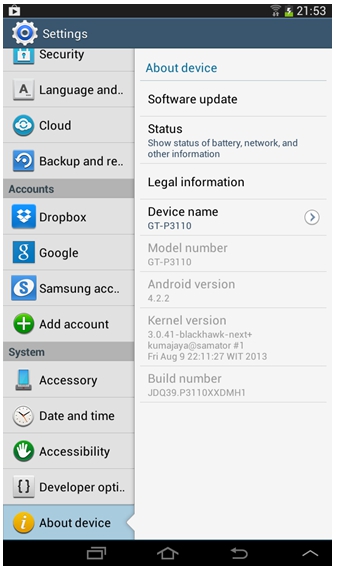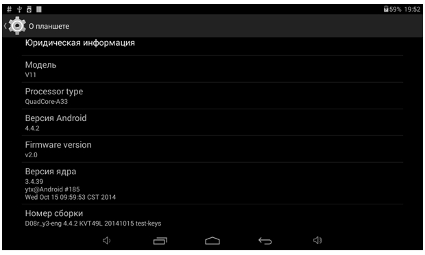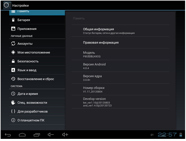 - следующие, что необходимо сделать, узнать правильную в планшете версию прошивки вашего устройства. Для этого заходим в «Настройки» -> «О устройстве» или «О планшете»;
